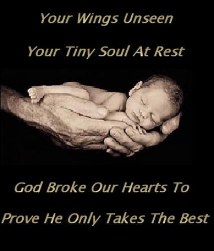mommy missis you so much you would have been almost ayear old if the lord hadent taken you but he has his plans even if i dont understand it yet i love you hunny and will be at the gate waiting when my time comes my forever angel you were so tiny when you went to heaven